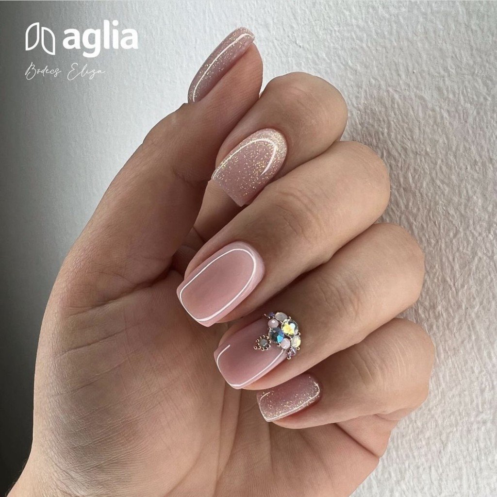 Gel UV colorato per unghie nella tonalità lattiginosa con glitter oro rosa.