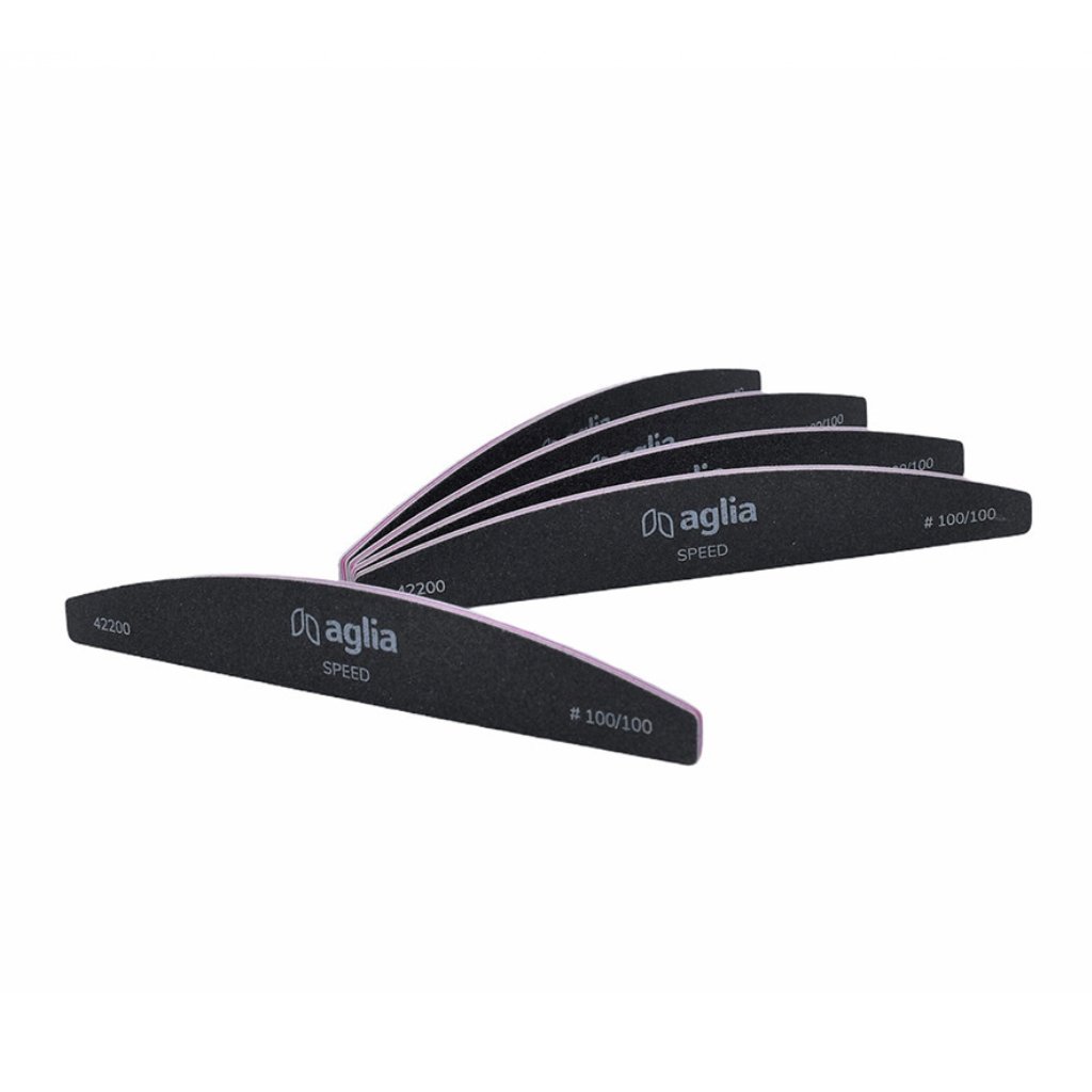 SPEED 100/100 – lima per unghie a forma di mezzaluna in colore nero, particolarmente adatta alla limatura di acrilico e gel duri. Grazie alla sua struttura solida, non si piega durante la limatura ed è completamente disinfettabile.